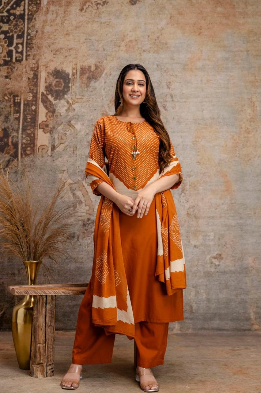 This pure cotton Bandhani kurti set features delicate handwork detailing, paired with a flowy palazzo and a complementing dupatta. Lightweight, breathable, and thoughtfully designed—perfect for the modern woman who embraces heritage with understated elegance.