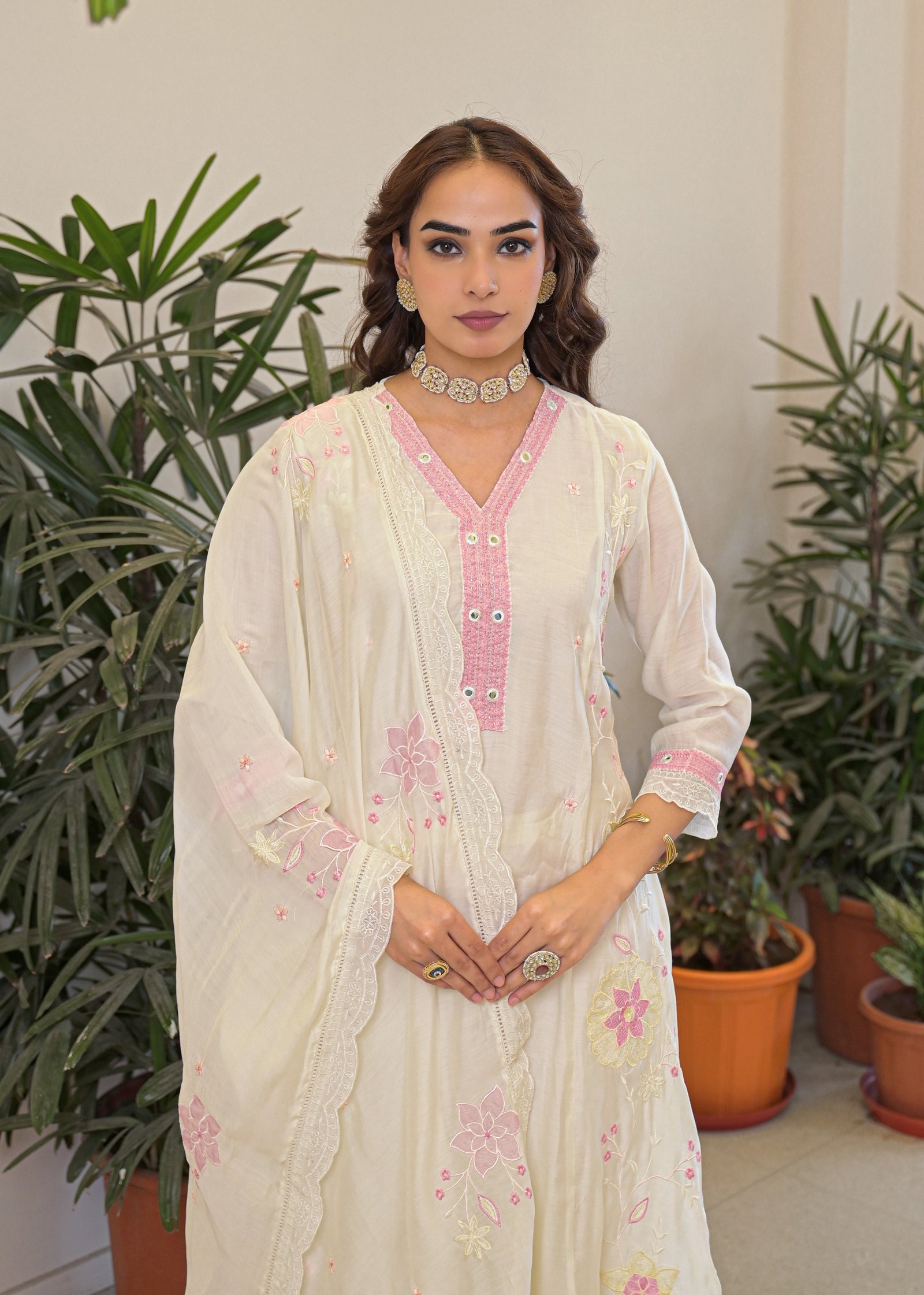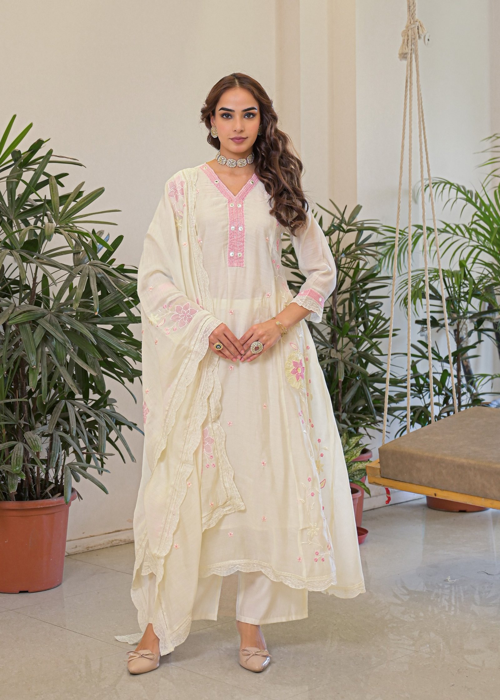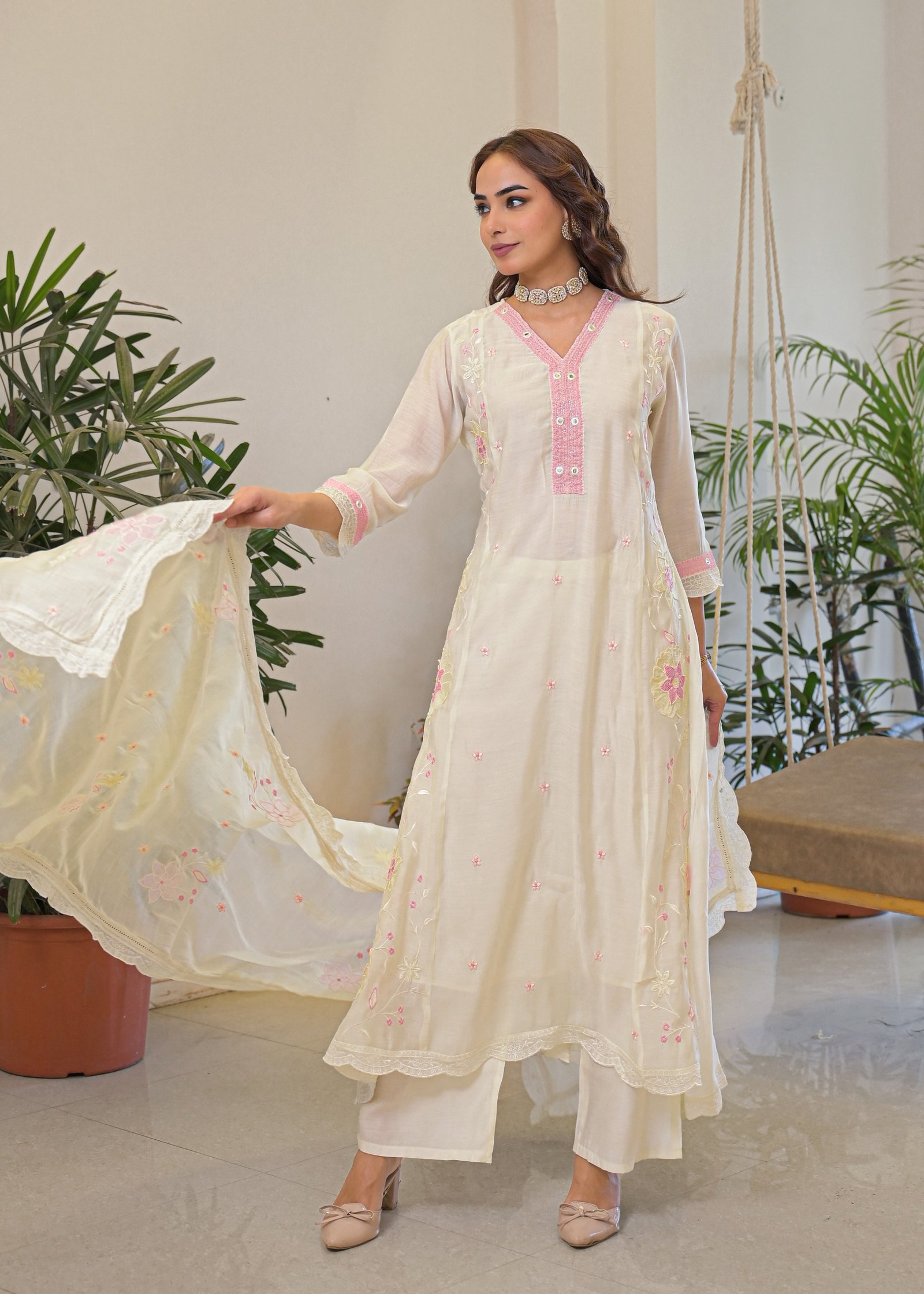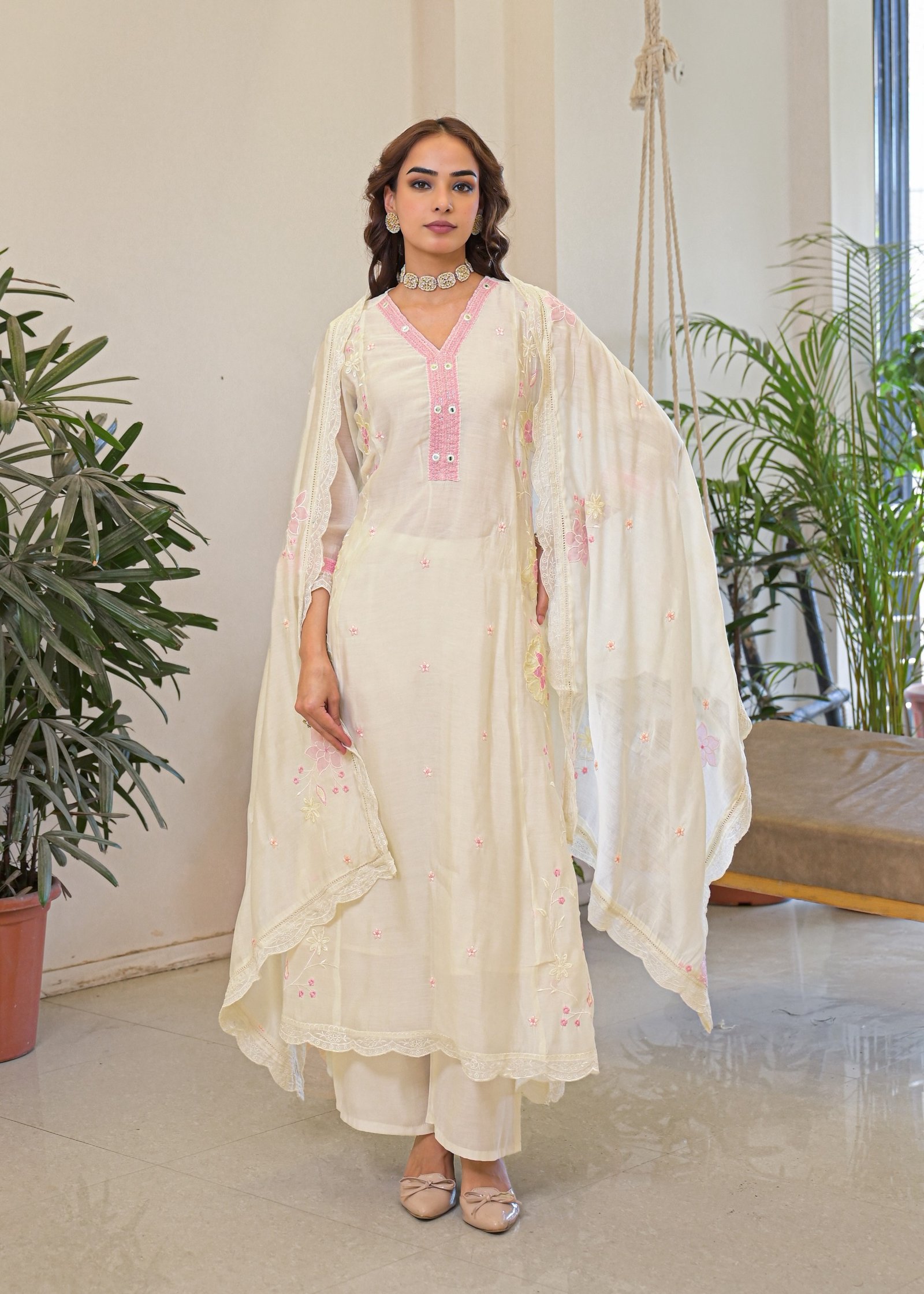 This Mul Chanderi kurti set features delicate cutwork embroidery, paired with a soft inner and a graceful dupatta. The fabric’s sheer texture and subtle sheen create an effortlessly elevated look—perfect for occasions that call for understated luxury.