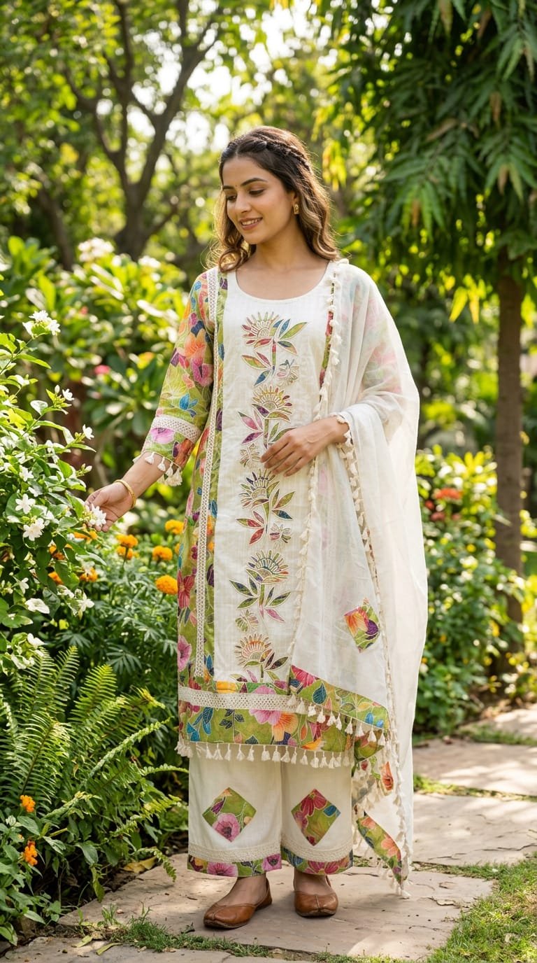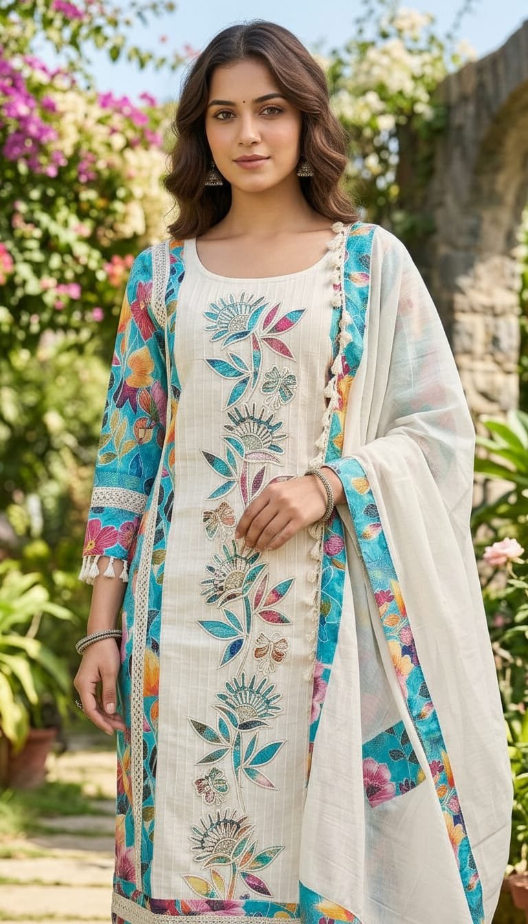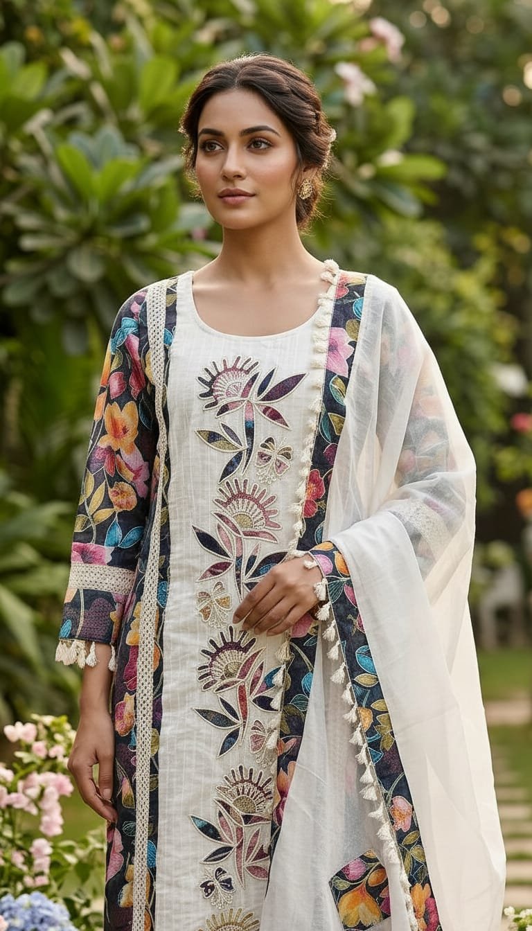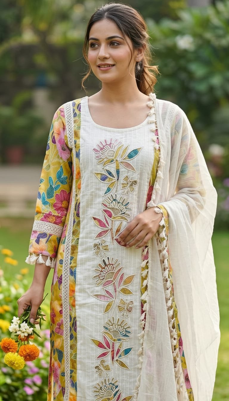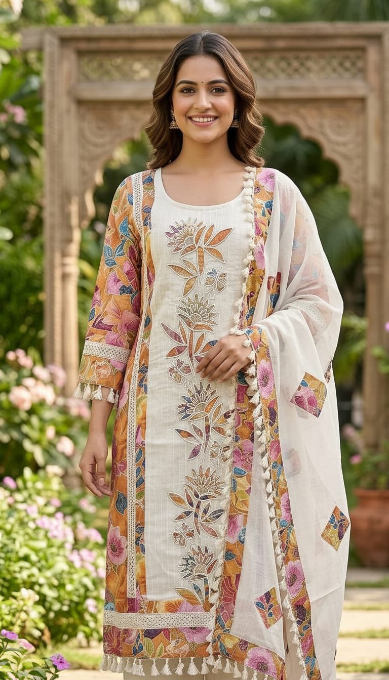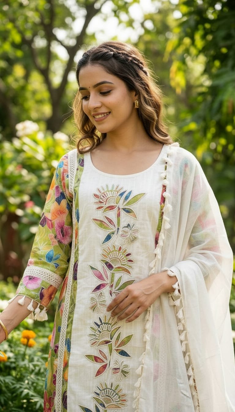 Artful appliqué detailing with a refined, contemporary finish. A statement in subtle craftsmanship.This pure cotton kurti set features elegant appliqué work, paired with comfortable pants and a complementing dupatta. Lightweight, breathable, and thoughtfully designed—perfect for the modern woman who appreciates detail in simplicity. Sizes: 38–44Free Shipping