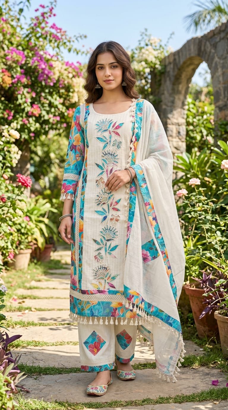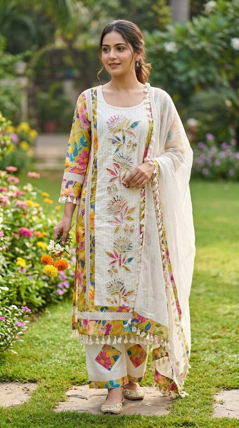 Pure Cotton Appliqué Work Kurti Set with Pants & Dupatta